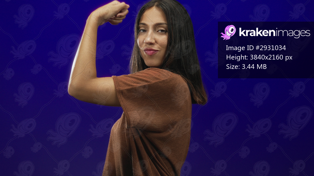 Woman flexes bicep and points finger to forehead in studio with deep blue backdrop; strength confidence empowerment.