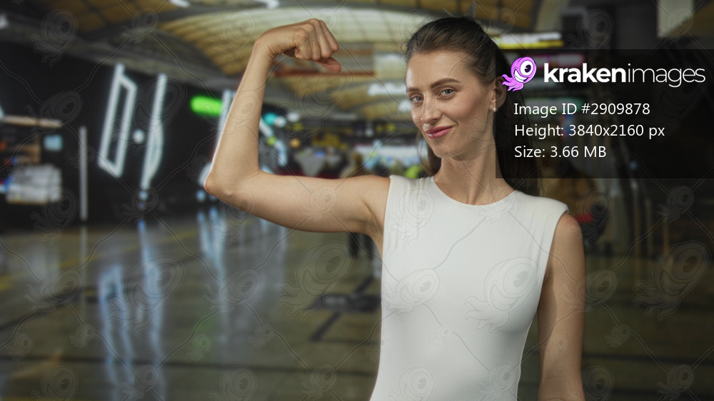 Woman flexes bicep and puckers lips while posing in a white sleeveless top inside an airport terminal concourse near departure signs; confidence.