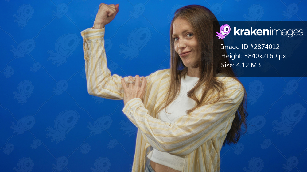 Woman flexes bicep and raises fist in studio blue backdrop, showing toned arm and casual striped shirt; confidence empowerment strength.