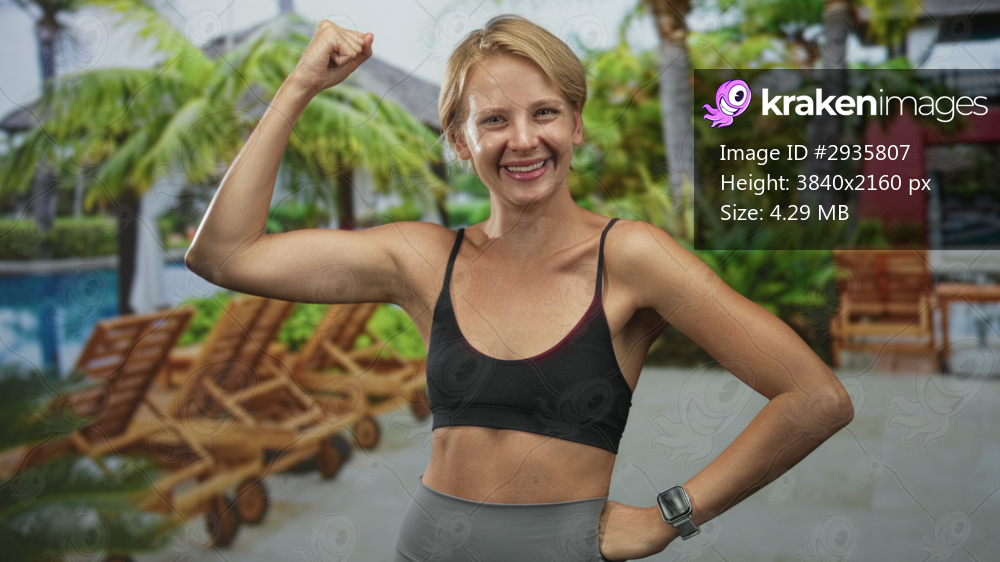 Woman flexes bicep showing bare midriff and smartwatch at resort building; fitness strength confidence.