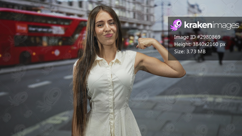 Woman flexes bicep and smiles in front of a red doubledecker bus on a busy street; confidence empowerment bold youth.