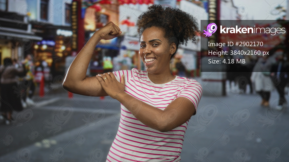 Woman flexes bicep and smiles on busy city street with lanterns and pedestrians while wearing striped pink tshirt; confidence empowerment.