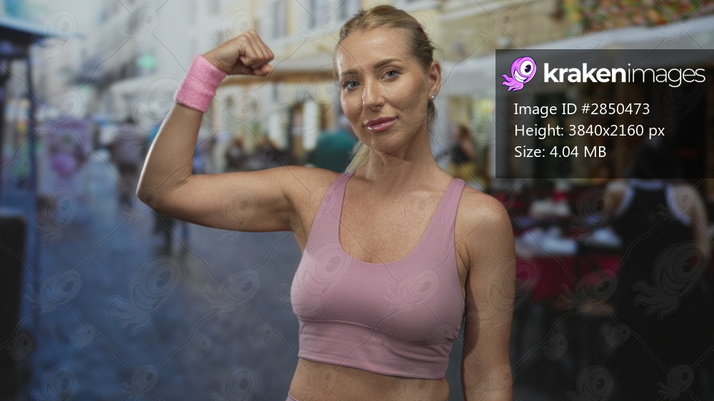 Woman flexes bicep and tilts head on city street in pink sportswear with wristband; confidence empowerment determination.