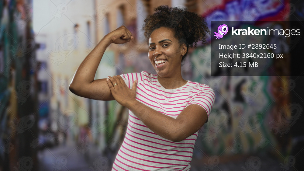 Woman flexes bicep and touches shoulder on graffiti covered city street, smiling and showing strength; confidence resilience.