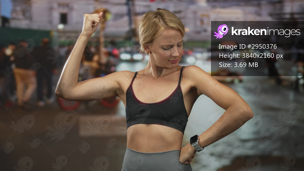 Woman flexes biceps with fist raised and hand on hip in street, wearing sports bra and smartwatch, posing near traffic and city building at night; confidence. - Kraken Images