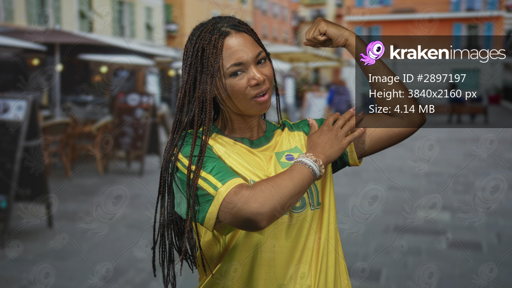 Woman flexes biceps and points to arm on outdoor street cafe terrace wearing yellow brazil soccer jersey with flag emblem; strength confidence.