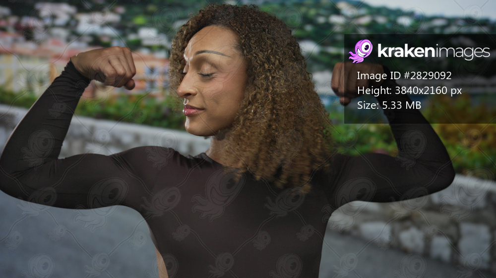 Woman flexes biceps wearing fitted top on sunlit street by stone wall; empowerment confidence pride strength.