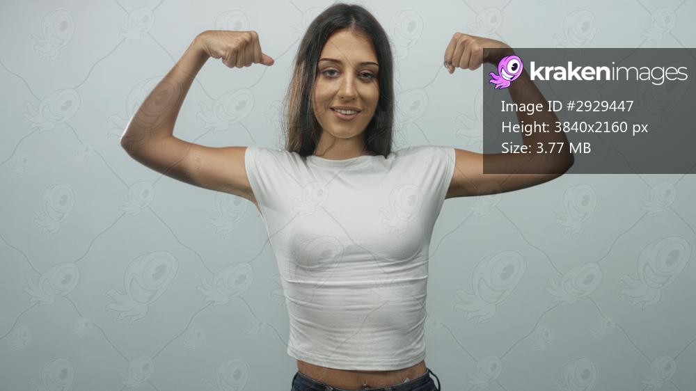 Woman flexes both arms showing biceps and midriff, smiling, wearing white tee and jeans in studio with pale blue backdrop; confidence.