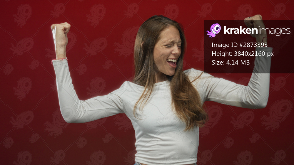Woman flexes fists in a red studio, smiling broadly with raised arms and clenched hands; joy empowerment.