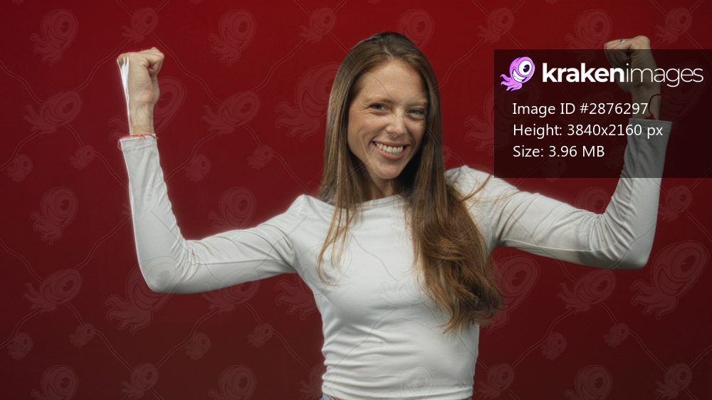 Woman flexes fists in a red studio, smiling broadly with raised arms and clenched hands; joy empowerment.