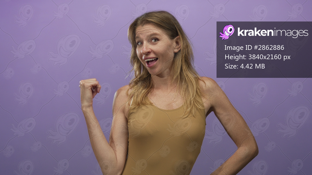 Woman flexes left arm and points thumb toward shoulder while smiling in studio with purple background; strength confidence.