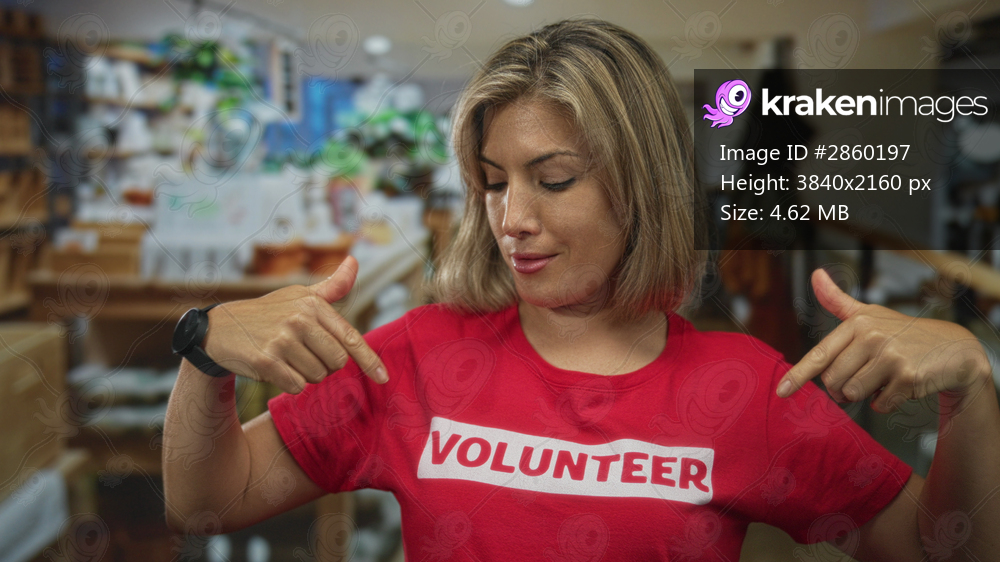 Woman flexes tensed arm muscles in bright home decor shop interior; empowerment confidence determination.