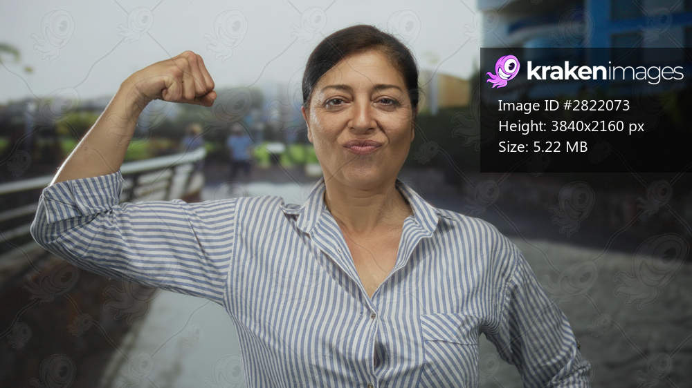 Woman flexing arm muscle in front of modern building beside a waterfront path; confidence empowerment.
