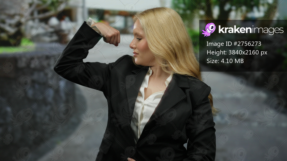 Woman flexing arm while wearing formal suit outdoors in urban city setting, symbolizing confidence and strength among green foliage and street background. - Kraken Images