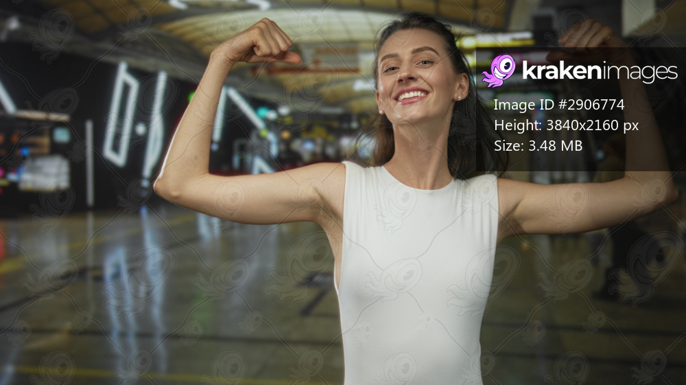 Woman flexing arms in an airport terminal, smiling and showing biceps for a travel pose; confidence travel empowerment.