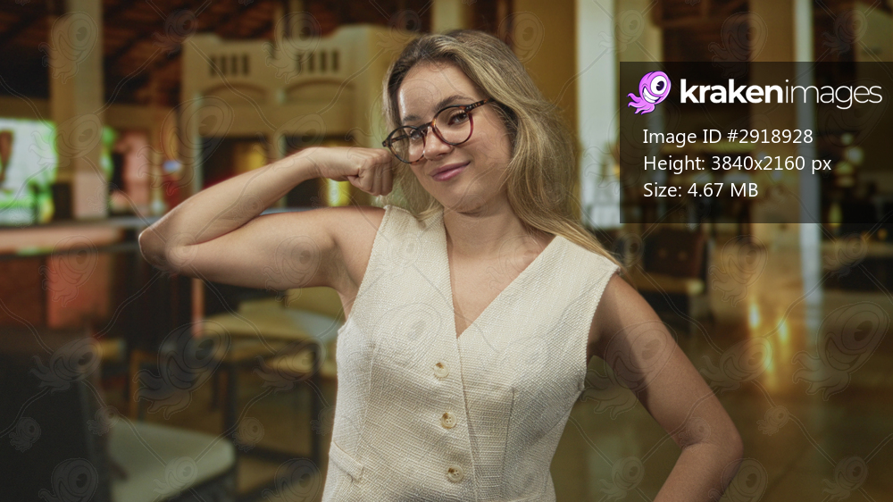 Woman flexing bicep in hotel building lobby, wearing sleeveless vest and glasses; confidence empowerment.