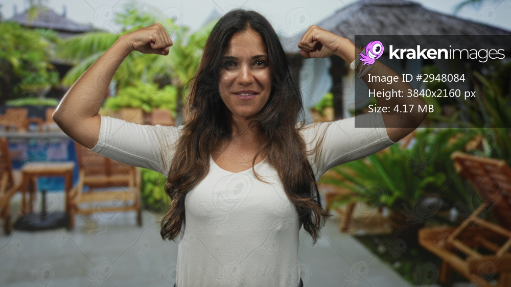 Woman flexing biceps at resort pool outdoors, smiling and showing forearms and bracelets; confidence.