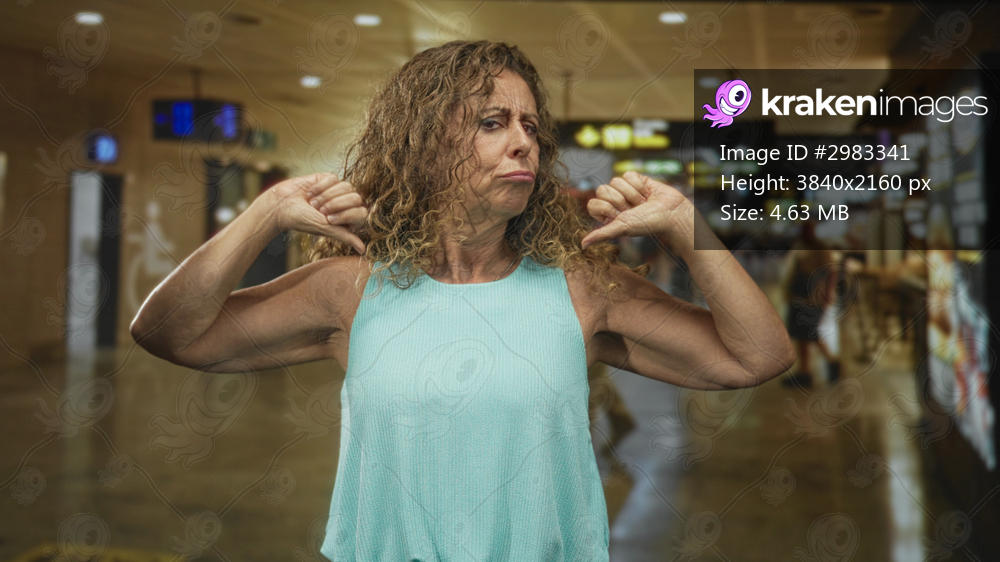 Woman flexing biceps with thumbs pointing to herself in an airport concourse, wearing a sleeveless teal top and stern pout; pride defiance resilience.