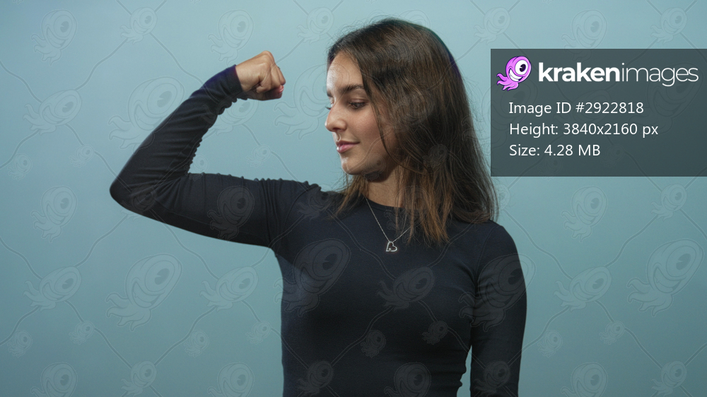 Woman flexing fist in studio against pale blue wall, wearing black long sleeve top and heart pendant; confidence empowerment.