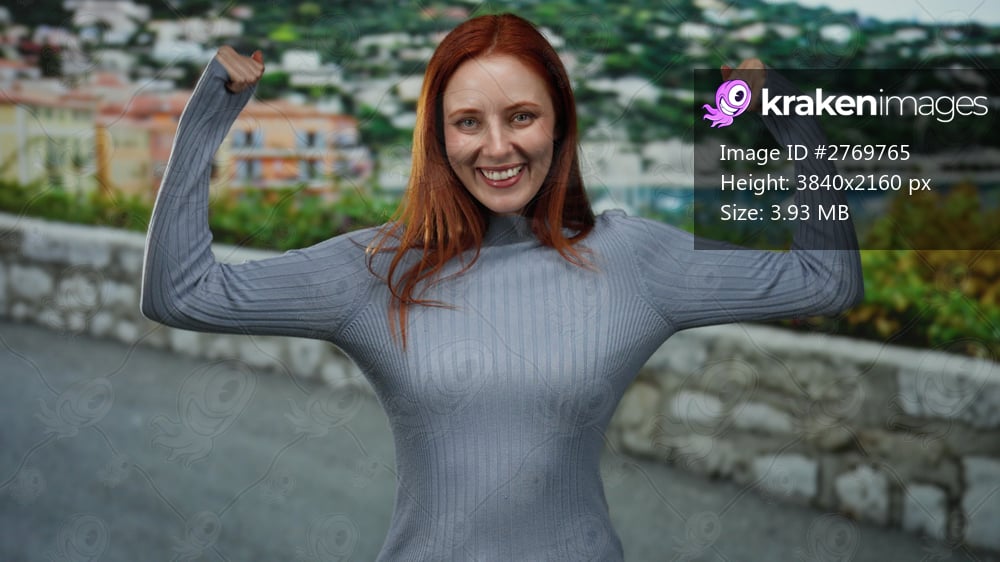Woman flexing muscles on seaside promenade with vibrant background showcasing ocean view and architecture.