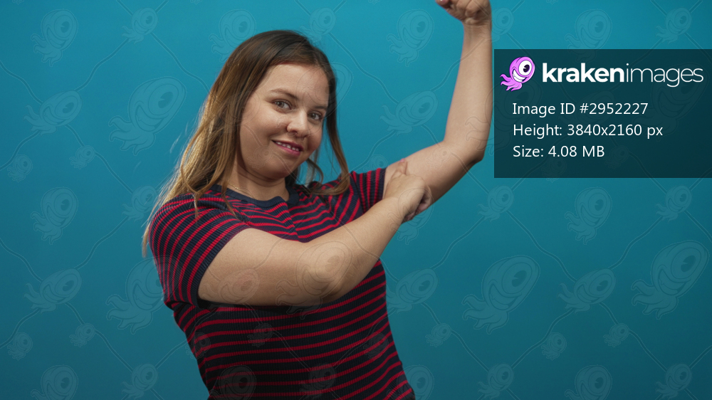 Woman flexing right arm and holding elbow in studio with teal backdrop wearing red striped shirt; confidence empowerment resilience.