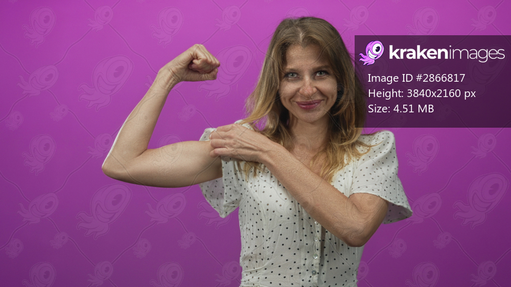 Woman flexing right bicep and smiling in magenta studio wearing polka dot dress with loose hair; confidence empowerment resilience.