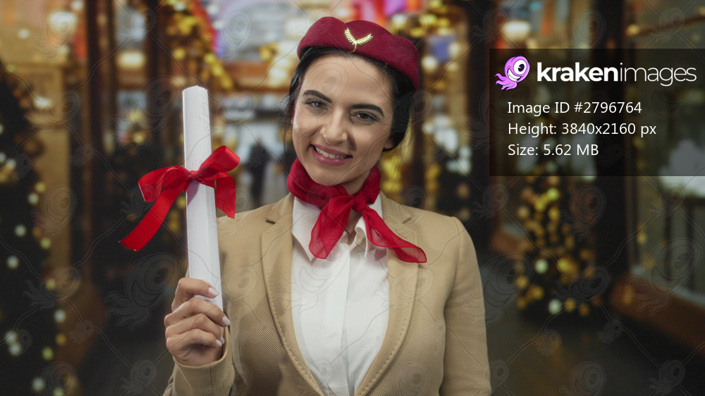 Woman flight attendant in uniform holding diploma on festive street at night with city lights in background, expressing pride and accomplishment after graduation - Kraken Images