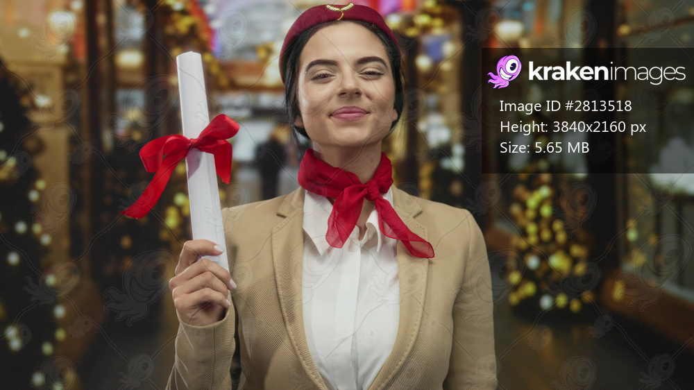 Woman flight attendant in uniform holding diploma on festive street at night with city lights in background, expressing pride and accomplishment after graduation - Kraken Images