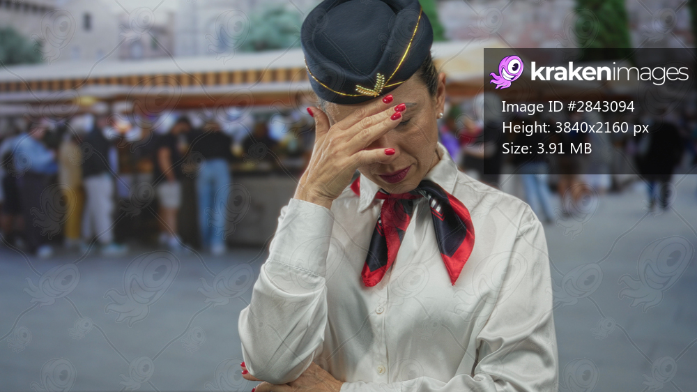 Woman flight attendant in white blouse and red scarf places hand to forehead on crowded street; fatigue.