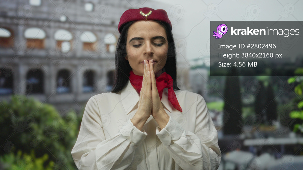 Woman flight attendant praying outdoors near roman coliseum in uniform, suggesting peace and contemplation amid iconic historical architecture in rome. - Kraken Images