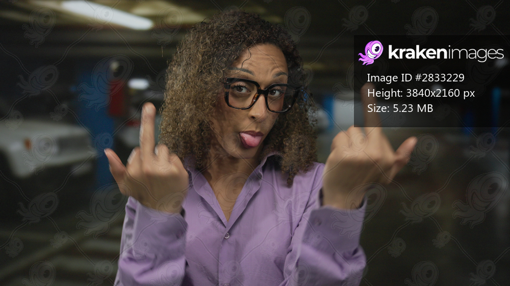 Woman flipping two middle fingers and sticking out tongue in a dimly lit urban parking garage; defiance.