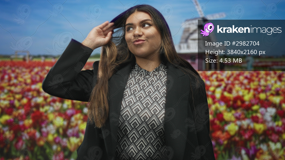 Woman flips hair and raises hand in tulip field by windmill wearing black blazer and patterned blouse; playful confidence.