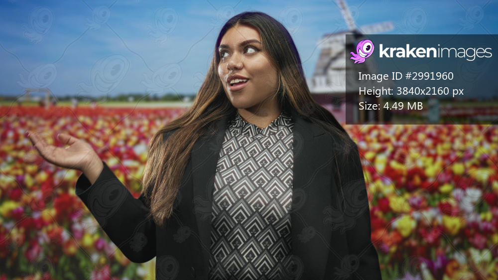Woman flips hair and raises hand in tulip field by windmill wearing black blazer and patterned blouse; playful confidence.