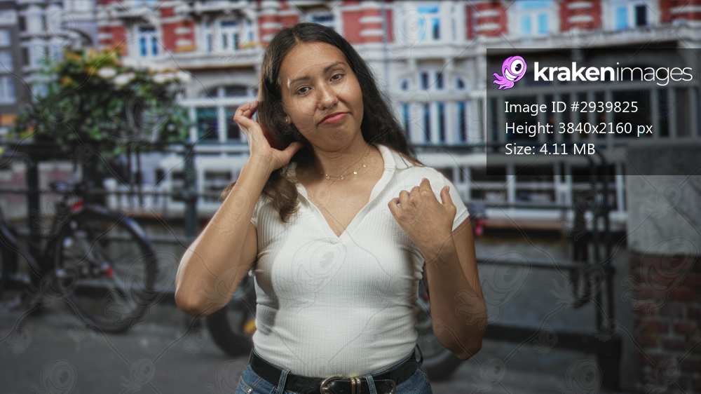 Woman flips hair and touches shoulder on amsterdam street with canal railing and bicycle visible; casual confidence.