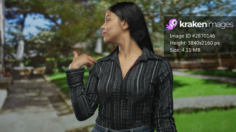 Woman flips long black hair with casual striped shirt in a lush green park under warm sunlight; confidence.