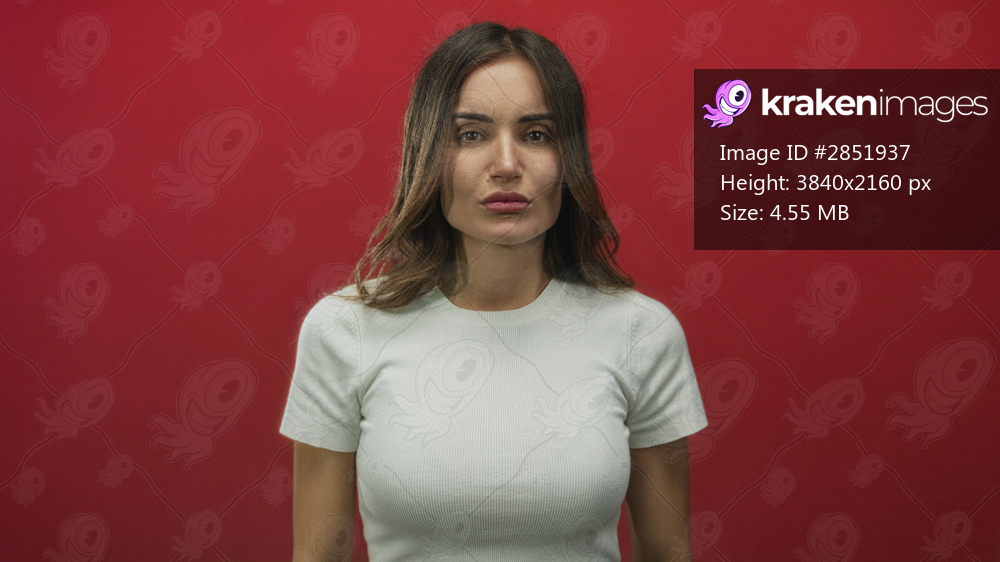 Woman flips middle finger while pouting at camera in red studio setting with tense expression and raised arms; rebellion provocation boldness defiance. - Kraken Images