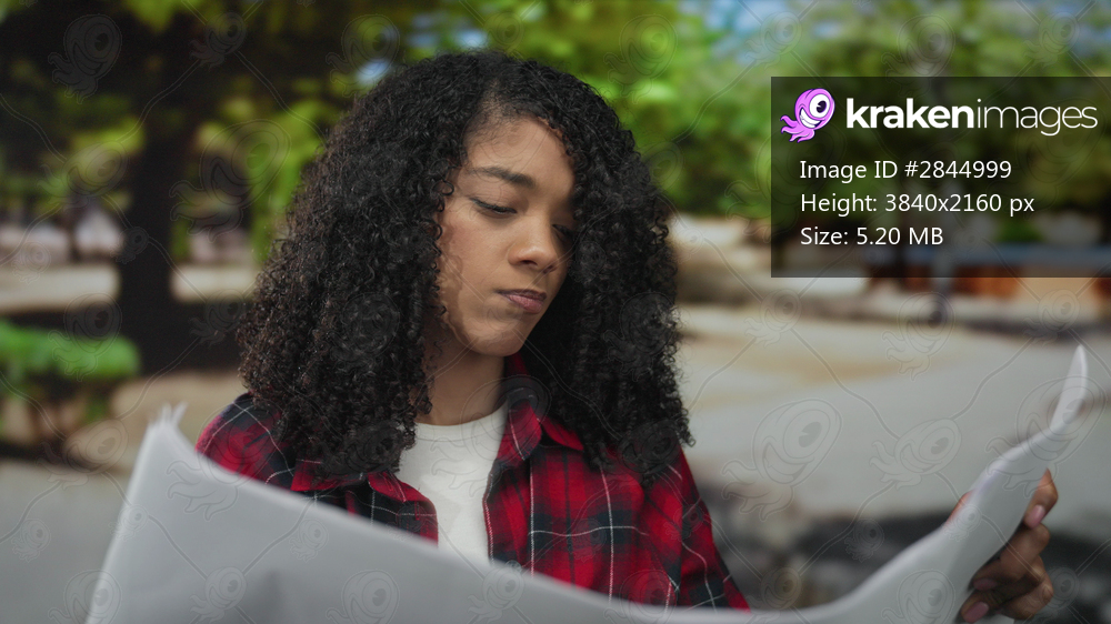 Woman flips paper pages in red flannel shirt while looking upward on street by green trees; quiet reflection.