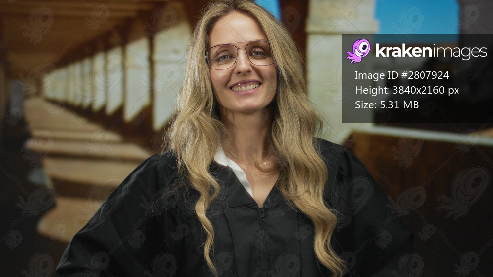 Woman with flowing hair expresses concern while standing on street, young blonde judge in uniform amid old town ambiance.