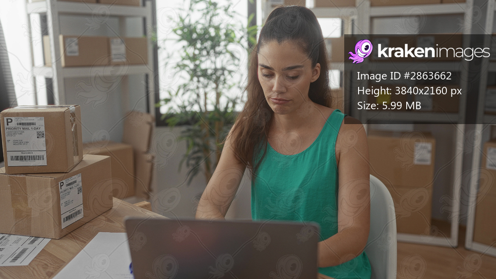 Woman with focused expression sits at desk working on laptop and points finger at parcel amid stacked boxes in building; efficiency.