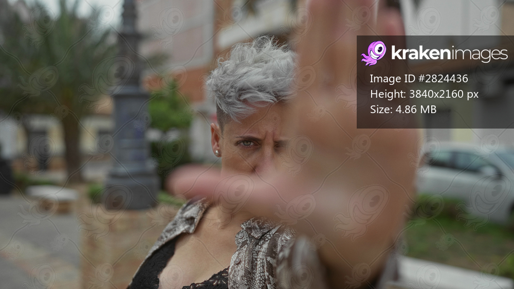 Woman with focused gaze and outstretched hand raised to block the camera on a sunlit urban street with palm trees and a car in view; defiance.