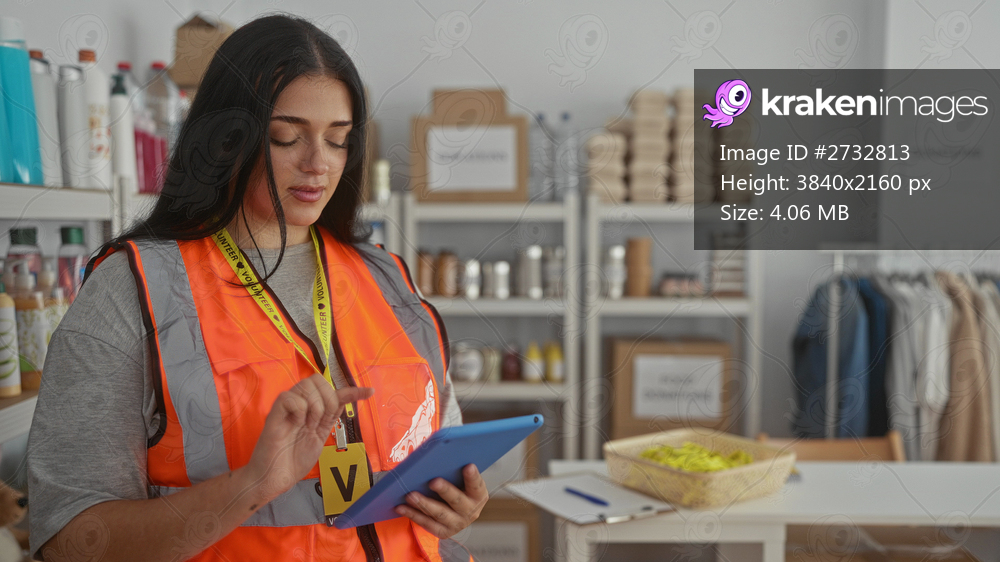 Woman focused on a tablet in a charity center filled with donations, highlighting volunteer effort in an indoor setting for community service projects. - Kraken Images