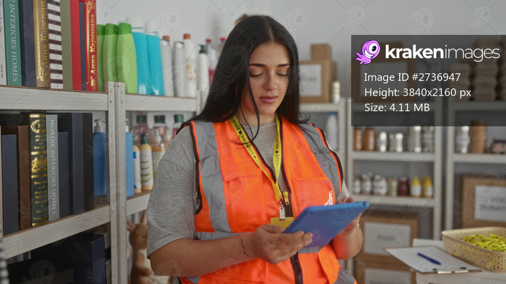 Woman focused on a tablet in a charity center filled with donations, highlighting volunteer effort in an indoor setting for community service projects. - Kraken Images