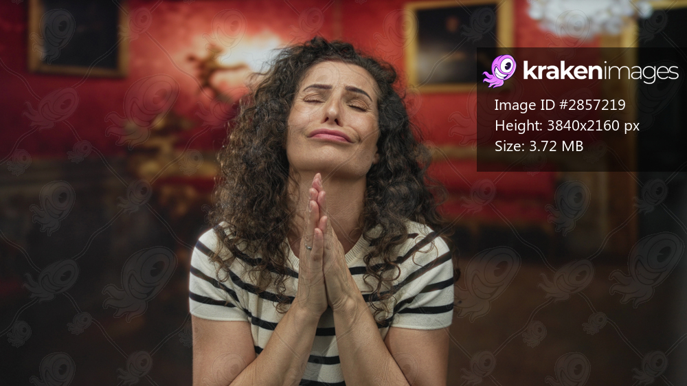 Woman folding palms in pleading gesture inside museum building under ornate chandelier near gilded painting; need.