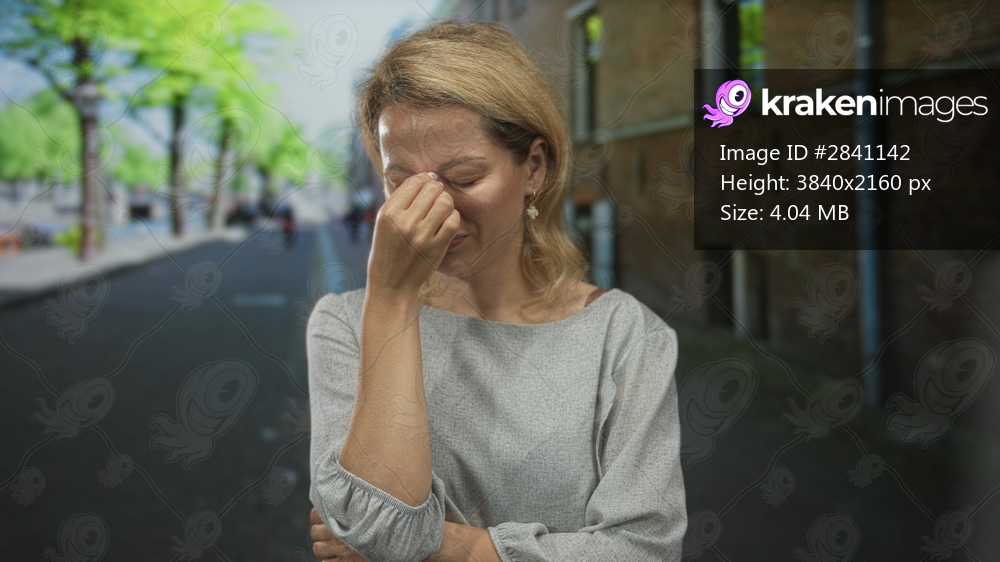 Woman folds arms and pinches nose in gray blouse on sunlit street lined with green trees and brick wall; disgust.