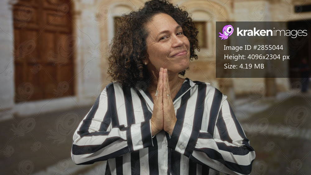 Woman folds hands in prayer pose on street in front of stone building wearing striped blouse; serenity.