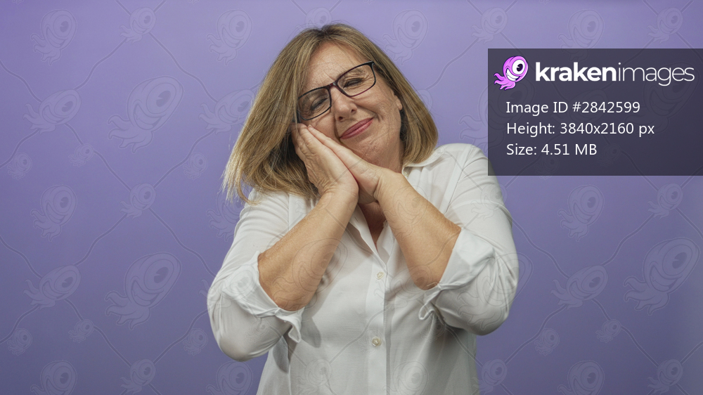 Woman folds hands under cheek gesture in studio with purple backdrop, head tilted and eyes closed; restful serenity.