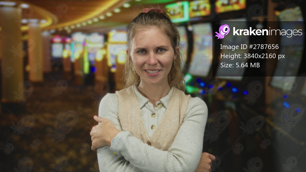 Woman folds her arms while smiling inside a casino lobby with a blonde young gambler beside slot machines at a game venue.