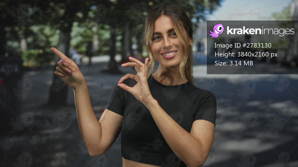 Woman forefinger pointing left and hand forming ok sign in sunlit park; approval direction positivity.