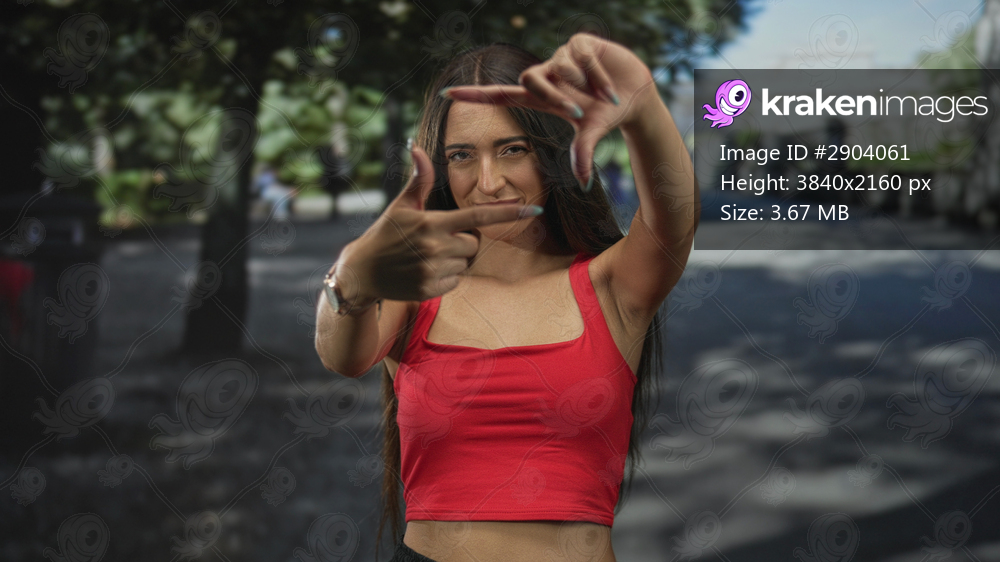 Woman forming a finger frame and smiling face on a sunny street in red crop top while looking through fingers toward camera; playful.