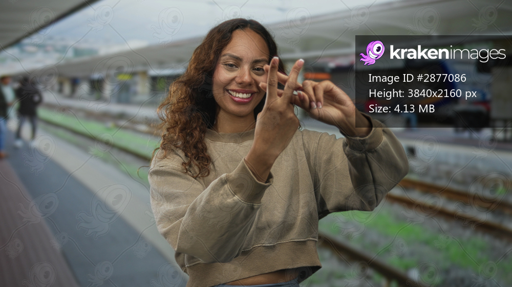 Woman forming a hashtag sign with hands while smiling at camera on a street platform by railway tracks in an outdoor station; youthful joy trend.